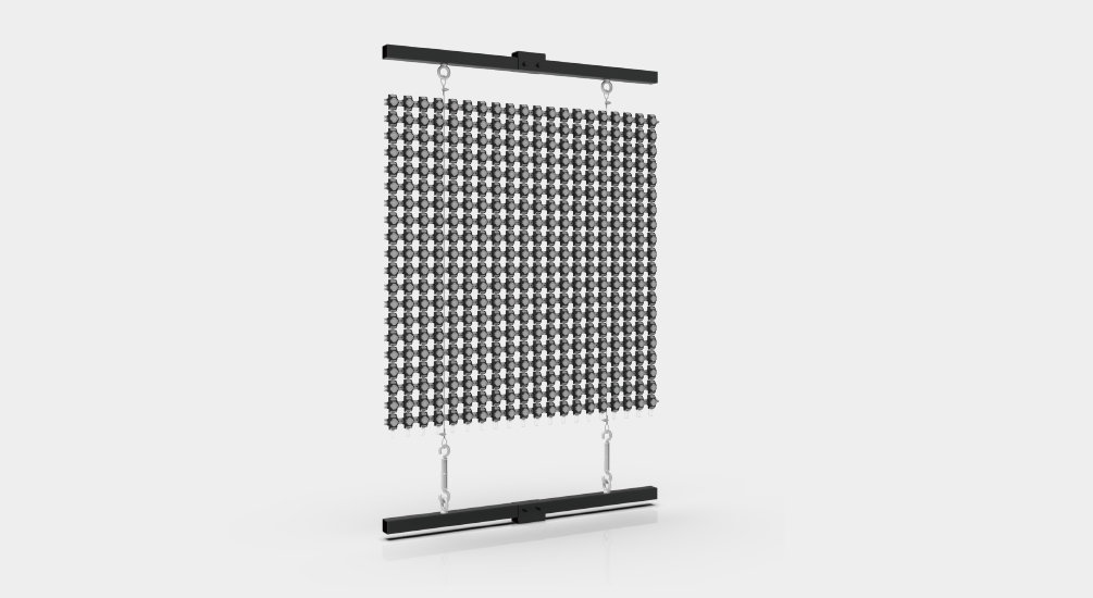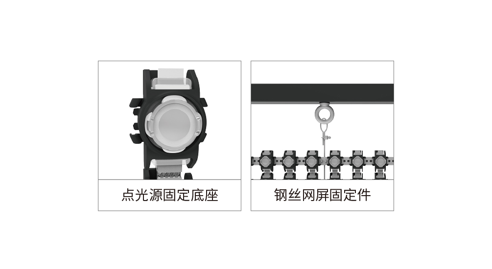 1、使用不銹鋼絲網(wǎng)作為光源固定。 2、采用二次封裝點光源配合塑膠固定件安裝。 3、易安裝、運維、運輸。